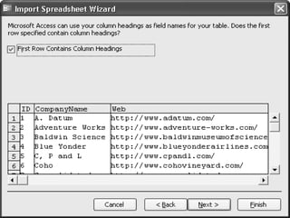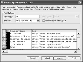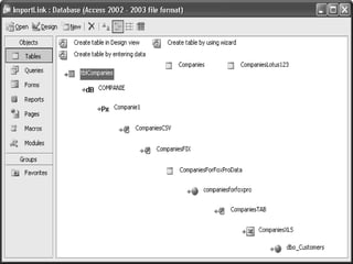 This document discusses importing and linking data from other databases into Microsoft Access. It provides guidelines for when to import vs link, including importing when the external file is small and not frequently updated, or when replacing an old database. Linking is preferred when the external file is large, frequently updated, or needs to be shared across a network. The document also covers how to import and link Excel, text, and dBASE files, as well as Access tables, queries, forms and other objects. It describes modifying linked tables and using the Linked Table Manager utility.