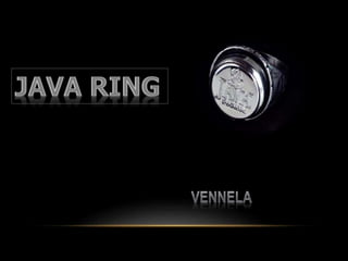 The Java Ring is a stainless steel ring containing a small microprocessor with built-in capabilities. It houses a 1-million-transistor processor called an iButton that contains 134kb of RAM, 32kb of ROM, a real-time clock, and a Java virtual machine. The Java Ring was developed in 1989 and has been tested in schools, allowing students to unlock doors, take attendance, and store medical information through programmed Java applets. It provides authentication through PINs and has applications for security and personalized services.