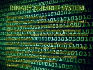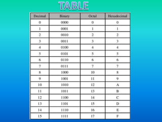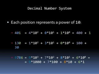 This document provides an overview of different number systems including decimal, binary, octal, and hexadecimal. It defines each system, their bases, examples of conversions between them, and their uses in computing. Decimal is base 10, binary is base 2, octal is base 8, and hexadecimal is base 16. Conversions between binary, decimal, octal and hexadecimal are demonstrated through examples. Number systems are important in computing because binary is used for electronic circuitry, octal and hexadecimal allow more compact notation than binary, and decimal is used for basic calculations.