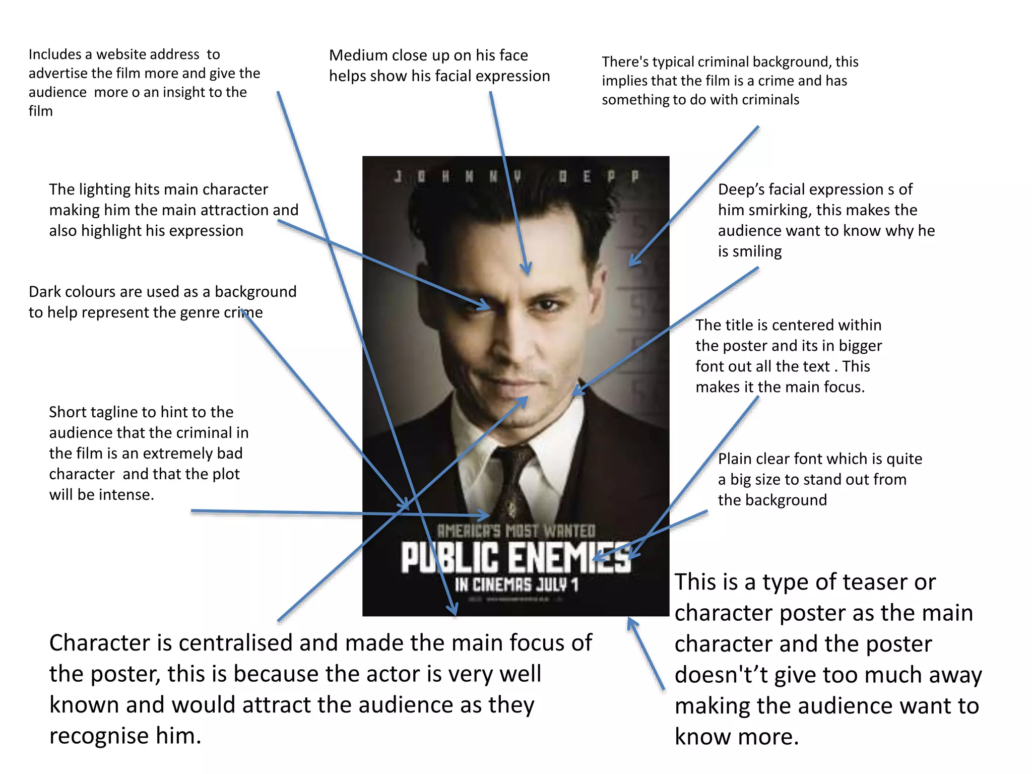 This document analyzes a movie poster for the film "Public Enemies" starring Johnny Depp. It examines various design elements of the poster and how they conform to or challenge conventions of movie posters and magazine covers. These elements include the central image of Depp, placement of the film title, use of font sizes, inclusion of other text details like release date and price, and positioning of logos and production company details. The document provides insights into how the poster effectively promotes the film and draws attention from audiences through its composition and adherence to typical media formats.