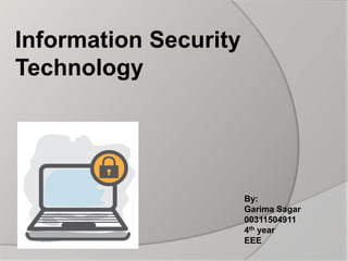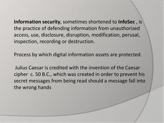 This document discusses various technologies used for information security, including cloud access security brokers, adaptive access control, virtual private networks, endpoint detection and response solutions, intrusion detection and analysis systems, interactive application security testing, antivirus software, firewalls, audit data reduction, network mapping, password cracking, public key infrastructure, and vulnerability scanning systems. It defines information security as protecting information and systems from unauthorized access, use, disclosure, destruction, modification, or disruption. The conclusion states that information security is an ongoing process involving training, assessment, protection, monitoring, detection, incident response, documentation, and review.