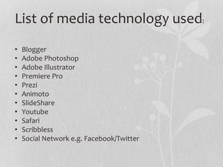 The document discusses the various media technologies used by the author at different stages of their project. These included Blogger for blogging, Adobe Photoshop and Illustrator for creating graphics, Premiere Pro for editing video, Prezi for presentations, Animoto for videos, SlideShare for sharing presentations, YouTube for uploading videos, Safari as a web browser, social networks like Facebook and Twitter, and Scribbless as an online checklist. The author found these technologies helped make their blog more media rich and presented their information and findings in a more interesting and effective way.