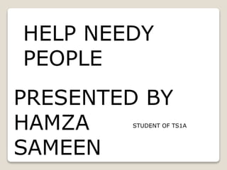 The document discusses ways to help needy people in society. It provides examples of how the presenter has helped needy children and young boys in the past by accepting small services and donations. It then asks questions to survey ways to help needy people such as donating money, food, clothes, and other items or organizing fundraising and collective community efforts. The concluding section emphasizes the importance of continuing to help address the problems faced by needy people in areas like money, food, shelter, and medicine.