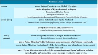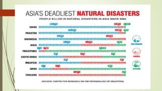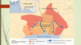 The document discusses the relationship between climate change and public health. It notes that climate change is expected to cause 250,000 additional deaths per year between 2030-2050 due to issues like malnutrition, malaria and heat stress. Areas with weak health infrastructure will be hardest hit. Reducing emissions through changes to transportation, food systems and energy use can improve health by reducing air pollution. Adaptation strategies highlighted include rebuilding health infrastructure and implementing measures at the primary, secondary and tertiary prevention levels. Megacity Bangkok is also discussed as being at high risk from sea level rise and flooding due to climate change.