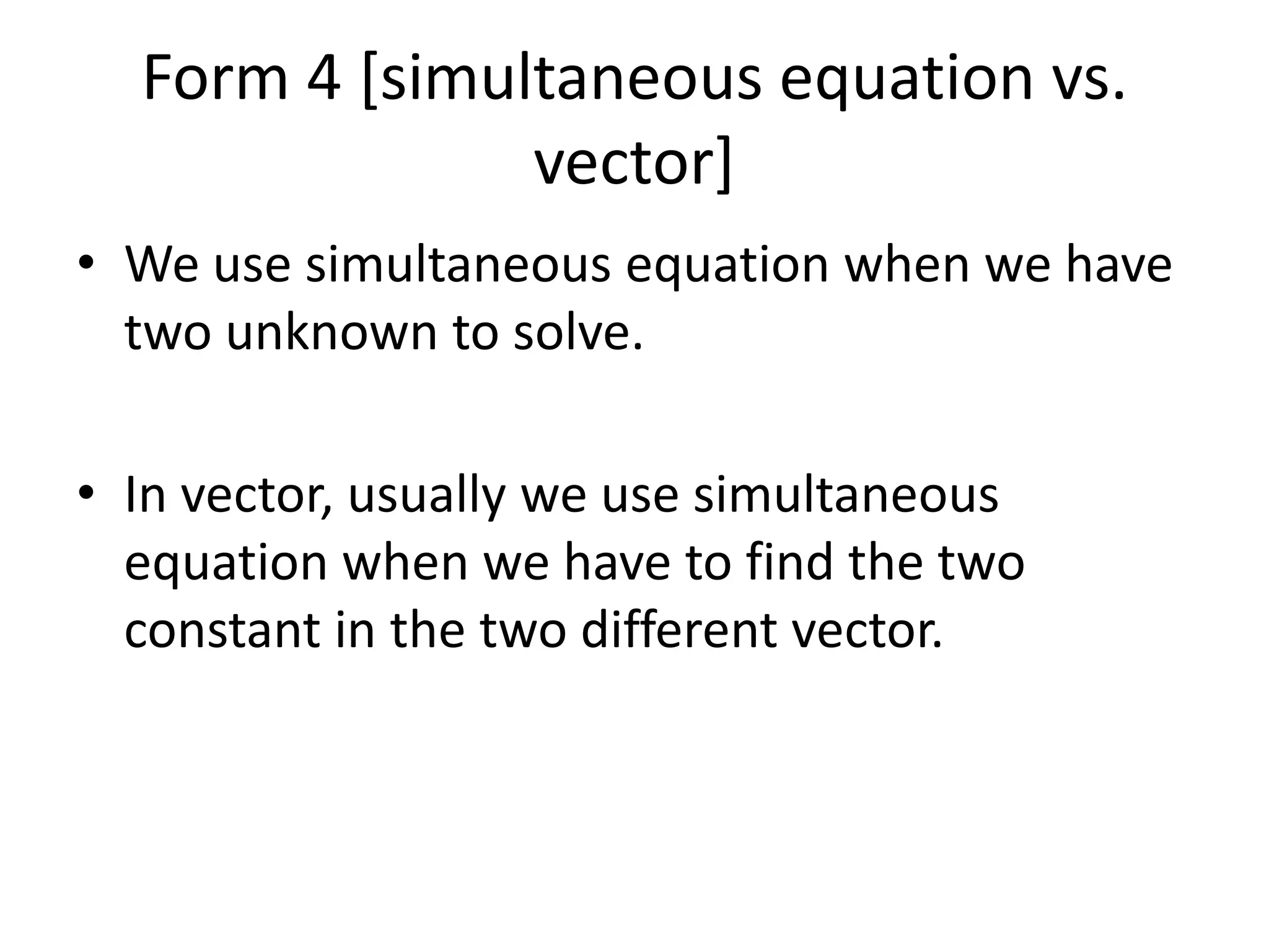 ![Form 4 [simultaneous equation vs. vector]We use simultaneous equation when we have two unknown to solve. In vector, usually we use simultaneous equation when we have to find the two constant in the two different vector.](https://image.slidesharecdn.com/presentation1-100801094624-phpapp02/75/Presentation1-1-2048.jpg)