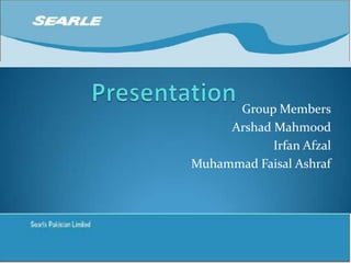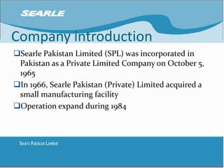 The document discusses Searle Pakistan Limited (SPL), including its founding in 1965 and expansion in 1984. SPL's vision is to improve quality of life through new research products, while its mission is to provide excellent healthcare and consumer products. The document then lists various financial ratios for analysis, including current ratio, quick ratio, asset management metrics, debt ratios, coverage ratios, and profitability metrics. It concludes with return on assets, return on equity, DuPont analysis, and Z-score model calculations.