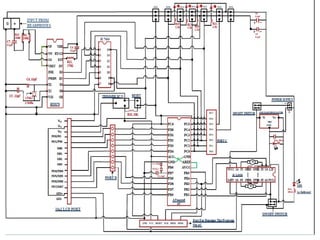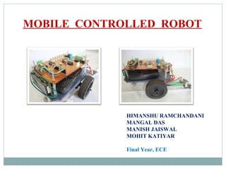 This document describes a mobile controlled robot that uses dual-tone multi-frequency (DTMF) tones sent from a cell phone to control the robot's movement. The robot uses a DTMF decoder chip to receive and decode DTMF tones into a 4-bit code that is read by a microcontroller. The microcontroller then sends signals to a motor driver chip which controls the two DC motors to move the robot forward, backward, left or right depending on the tone received. The overall system allows remote control of the robot's movement via DTMF tones sent from a mobile phone.