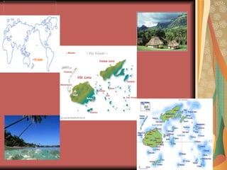 Fiji consists of over 300 islands, with the two largest being Viti Levu and Vanua Levu. The climate is tropical, with warm and humid conditions year-round. Fijian culture incorporates influences from the indigenous Fijian people as well as Indian immigrants. Traditional Fijian meals center around starches like taro or yams along with fish, meat, and vegetables, while holidays integrate both Christian and Hindu traditions.