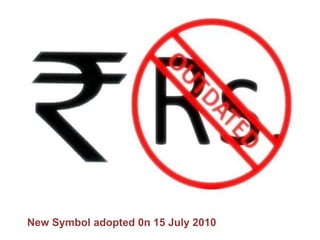 The document summarizes the adoption of a new symbol for the Indian rupee currency. Some key points:
