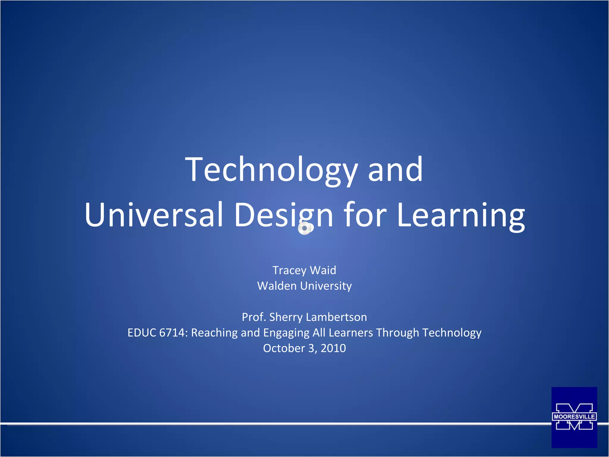 This document provides an overview of Universal Design for Learning (UDL), including its principles and how it can be implemented using technology. UDL is an educational framework based on brain research that provides flexibility in how content is presented, how students demonstrate their knowledge, and student engagement. It aims to address the diverse needs of all learners by incorporating multiple means of representation, action and expression, and engagement. The document discusses UDL's three principles and potential tools teachers can use, such as the CAST website which contains lesson plans and strategies that follow UDL guidelines.