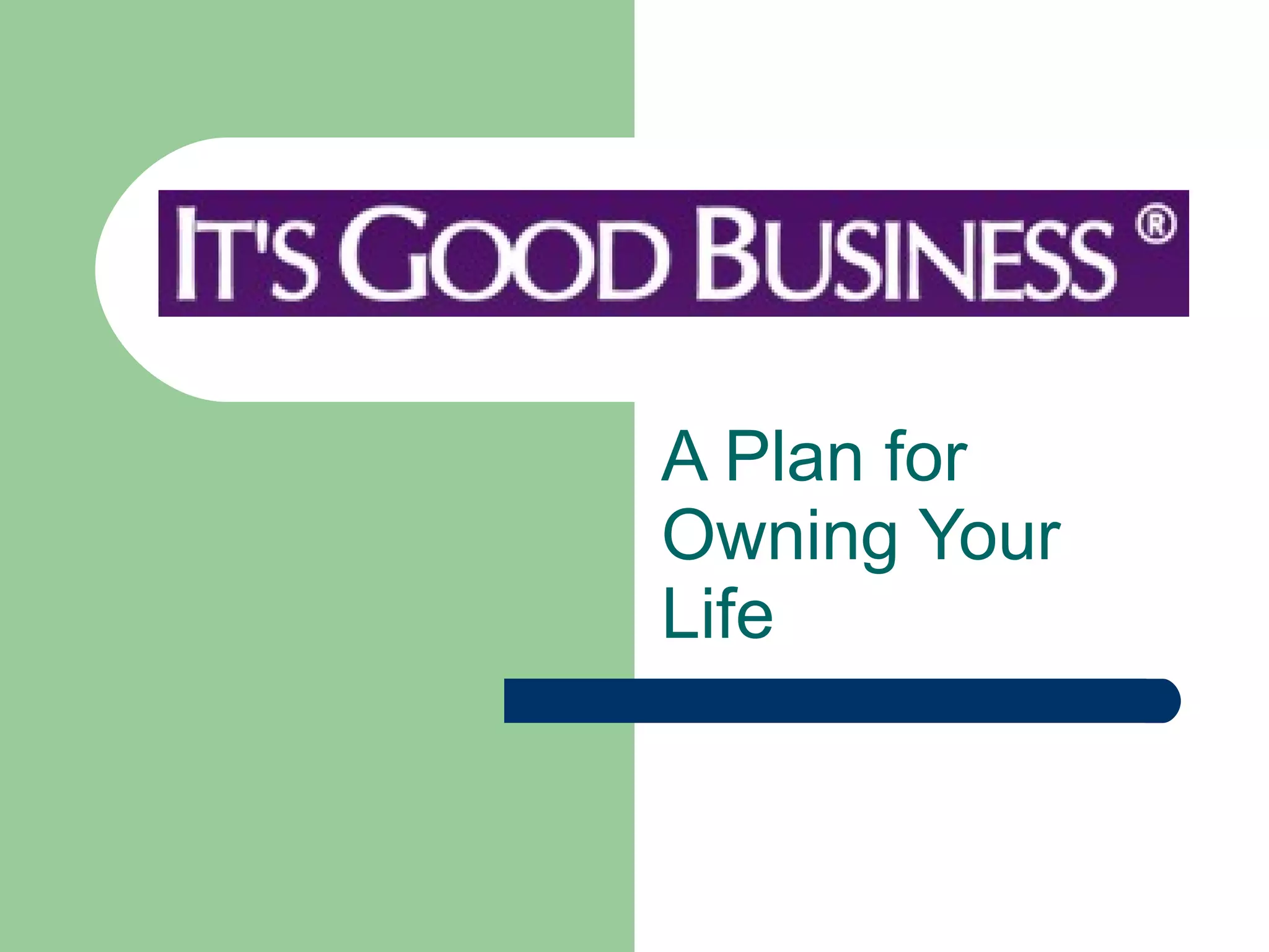 This document outlines a plan for owning your life through building a network marketing business. It discusses how most people have little free time after daily responsibilities. It then proposes that building an online network marketing business using search engine optimization and educational marketing can provide ultimate wealth through a passive income. The document details the basic components and resources needed to implement this business model, including using various tools and the support of an independent representative company.