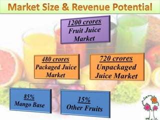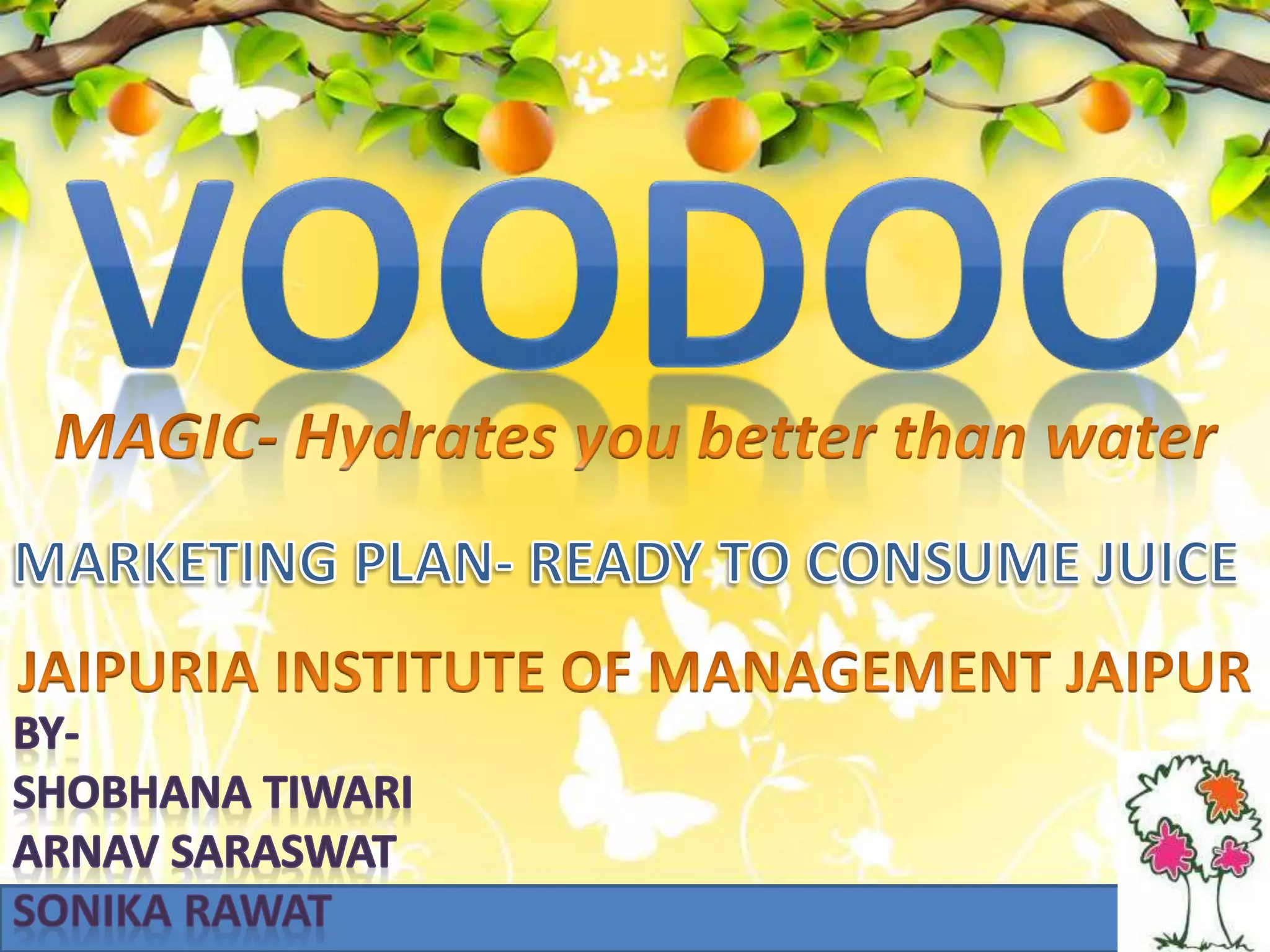 Voodoo is a juice company that manufactures 100% fruit and vegetable juices using an advanced technology. It aims to be India's premier fruit juice company offering nutritious drinks to consumers. Voodoo grows its own certified organic crops and uses natural pest control methods. It faces competition from established brands but sees an opportunity in the growing fruit and vegetable drink market. Voodoo plans to target different age groups and establish a production and distribution network across India to achieve its goal of gaining 5% market share within a year.