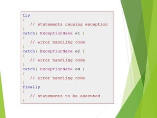 This document discusses exception handling in C#. It defines an exception as a problem that arises during program execution, such as dividing by zero. It describes how try, catch, and finally keywords allow programmers to transfer control when exceptions occur. The try block identifies code that could cause exceptions. Catch blocks handle specific exception types. Finally blocks contain code that always executes regardless of exceptions. Common exception classes derive from System.Exception. The example shows a method catching and handling a DivideByZeroException using try, catch, and finally.