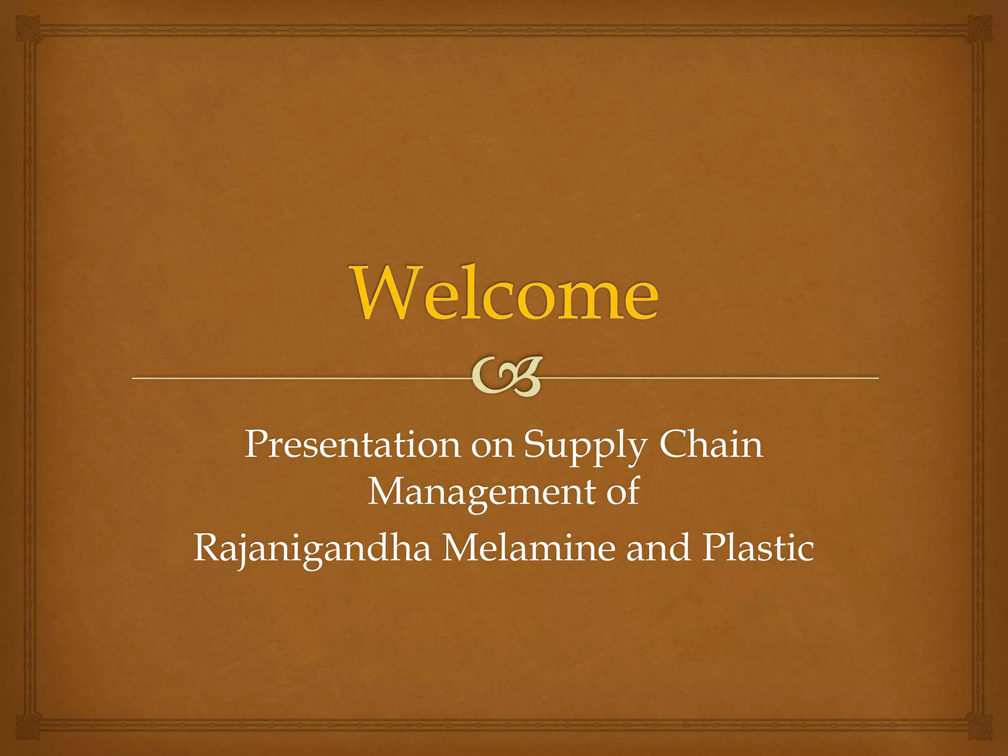 This presentation summarizes the supply chain of Rajanigandha Melamine and Plastic. It introduces the company and outlines its supply chain drivers including facilities, inventory, transportation, information, and sourcing and pricing strategies. It then describes the company's supply chain processes and distribution network design. It analyzes the company's performance in terms of costs and service and identifies problems around its information systems, customer interaction, research and development, and sales. Finally, it provides recommendations to improve collaboration, implement an information system, create a customer base, optimize resource utilization, and manage accounts receivable.