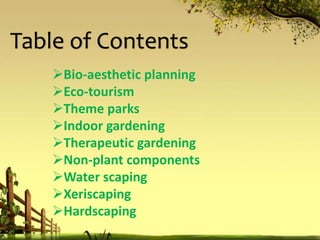 This document provides an overview of various topics related to landscaping and gardening. It discusses bio-aesthetic planning, eco-tourism, theme parks, indoor gardening, therapeutic gardening, non-plant components, waterscaping, xeriscaping, and hardscaping. For each topic, it outlines key principles, examples, benefits, and considerations. The document serves as a comprehensive reference guide for different approaches to landscaping and garden design.