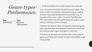 The document discusses different genres of music videos including performance, narrative, and upbeat narratives. Performance videos involve the artist singing and dancing but can become repetitive. Narrative videos relate to the song lyrics but can be boring depending on the story. Upbeat narratives about teenage fun and memories were seen as a good option, allowing for low budgets but gripping visuals. Examples like "Calling" and "Robbers" used this style without strict narratives and resembled teenage rebellion through various shooting techniques. This upbeat narrative genre is likely what the document will create.