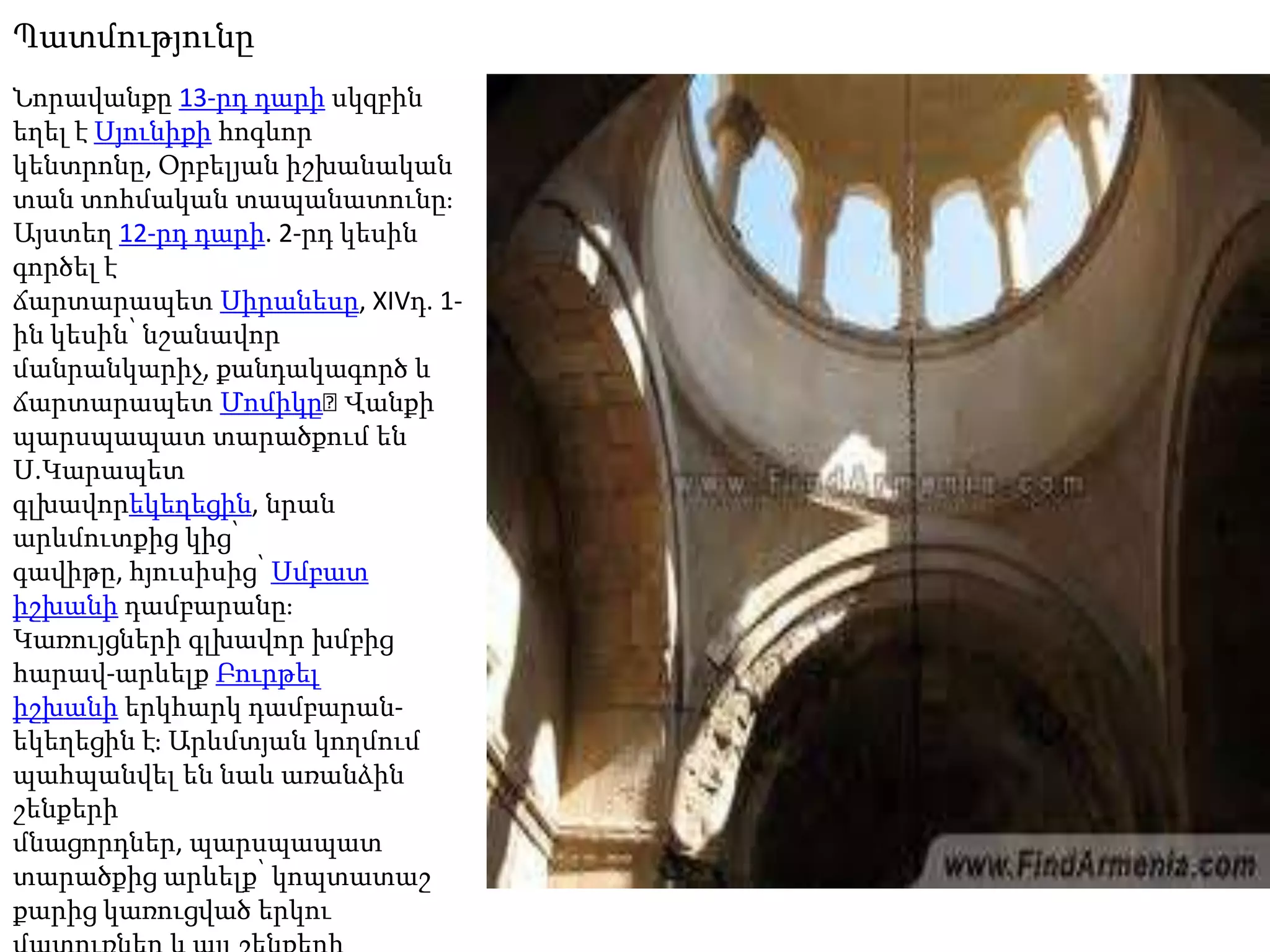 ՊատմությունըՆորավանքը 13-րդ դարի սկզբին եղելէ Սյունիքի հոգևոր կենտրոնը, Օրբելյան իշխանական տան տոհմական տապանատունը։ Այստեղ 12-րդ դարի. 2-րդ կեսին գործել է ճարտարապետ Սիրանեսը, XIVդ. 1-ին կեսին՝ նշանավոր մանրանկարիչ, քանդակագործ և ճարտարապետ Մոմիկը։ Վանքի պարսպապատ տարածքում են Ս.Կարապետ գլխավորեկեղեցին, նրան արևմուտքից կից՝ գավիթը, հյուսիսից՝ Սմբատ իշխանի դամբարանը։ Կառույցների գլխավոր խմբից հարավ-արևելք Բուրթել իշխանի երկհարկ դամբարան-եկեղեցին է։ Արևմտյան կողմում պահպանվել են նաև առանձին շենքերի մնացորդներ, պարսպապատ տարածքից արևելք՝ կոպտատաշ քարից կառուցված երկու մատուռներ և այլ շենքերի հիմնապատեր։