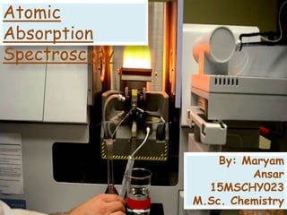 This document discusses atomic absorption spectroscopy, including its history, principles, instrumentation, and applications. Atomic absorption spectroscopy is a technique used to determine the concentration of metal elements in samples. It works by measuring the absorption of light by vaporized ground-state metal atoms. The document outlines the key components of atomic absorption spectroscopy systems, including light sources, nebulizers, atomizers, and detectors. It also describes how the technique has been applied to areas like clinical analysis, environmental analysis, and mining.
