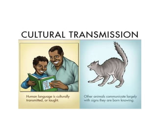 2. Cultural transmission - Language is culturally transmitted from one generation to the next, rather than through heredity.