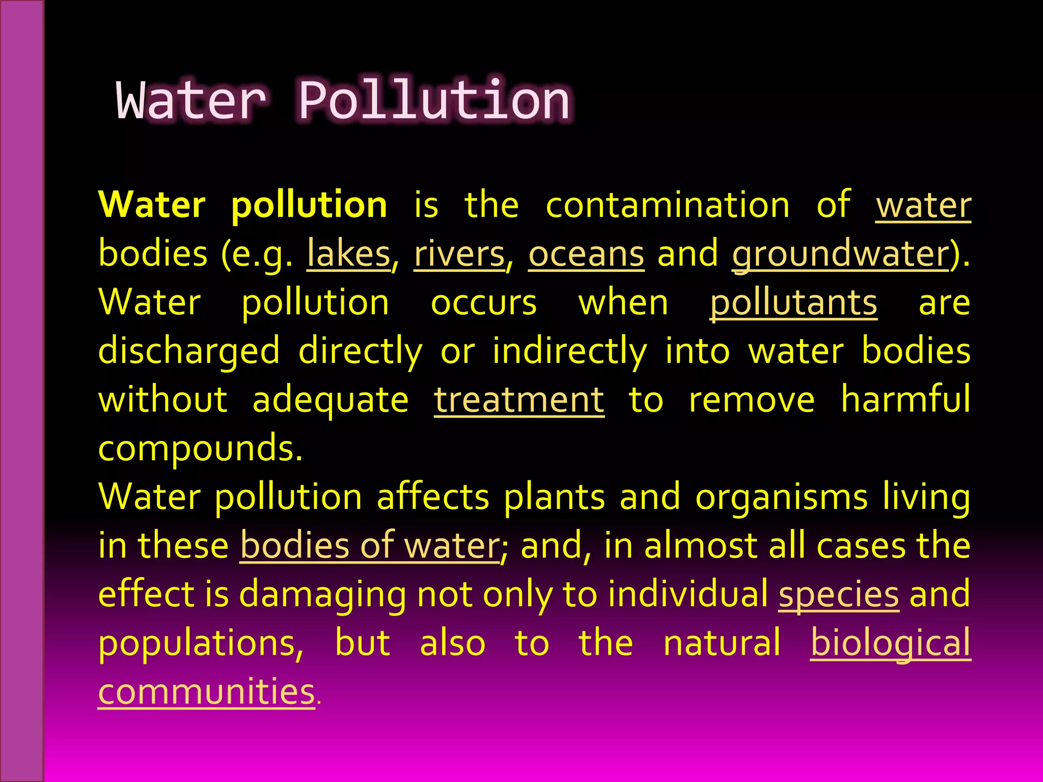 This document discusses various types and causes of water pollution. It describes toxic, organic, and thermal pollution and their effects on aquatic ecosystems. Various point and nonpoint sources of pollution are outlined, including pollution from farming, industry, and daily human practices. Signs of polluted water and methods for addressing pollution through education, laws, and economics are also summarized.