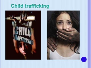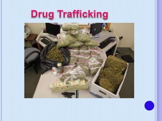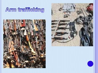 Tinutukoy ng dokumento ang iba't ibang uri ng trafficking, kabilang ang human trafficking, arm trafficking, at drug trafficking. Ang human trafficking ay may iba't ibang anyo tulad ng mail order bride, child trafficking, at sex trafficking, na nagiging sanhi ng dahas at pang-aalipin. Ang arm at drug trafficking naman ay kinasasangkutan ng pagpupuslit ng ilegal na armas at bawal na gamot, na nagdudulot ng malaking problema sa ekonomiya at seguridad sa iba't ibang bahagi ng mundo.