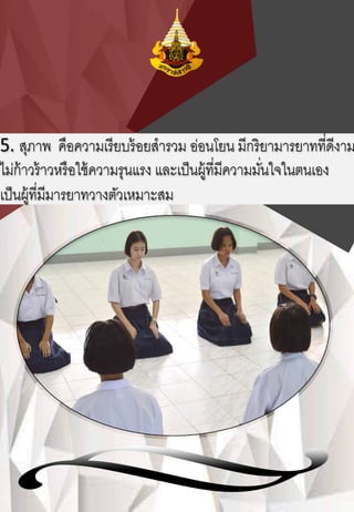 4. มีวินัย เช่นการต่อแถวในการซื้อกับข้าวหรือจะทาอะไรต่างๆ คนเราก็ต้องมีวินัยในตัวเอง วินัยถือเป็นการสร้างระเบียบที่ดีให้ตนเอง ชุมชนและสังคมประเทศชาติ การมีวินัยเกิดจากการฝึกด้วยตัวของเราเอง