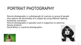 This document discusses different types of photography including portrait, landscape, macro/nature, and fashion photography. Portrait photography captures personality through lighting, backdrops and poses. Landscape photography shows vast natural or man-made spaces. Macro photography involves extreme close-ups of small subjects like insects. Fashion photography is used to glamorize and sell products through creative visuals utilizing location, lighting, styling and models.