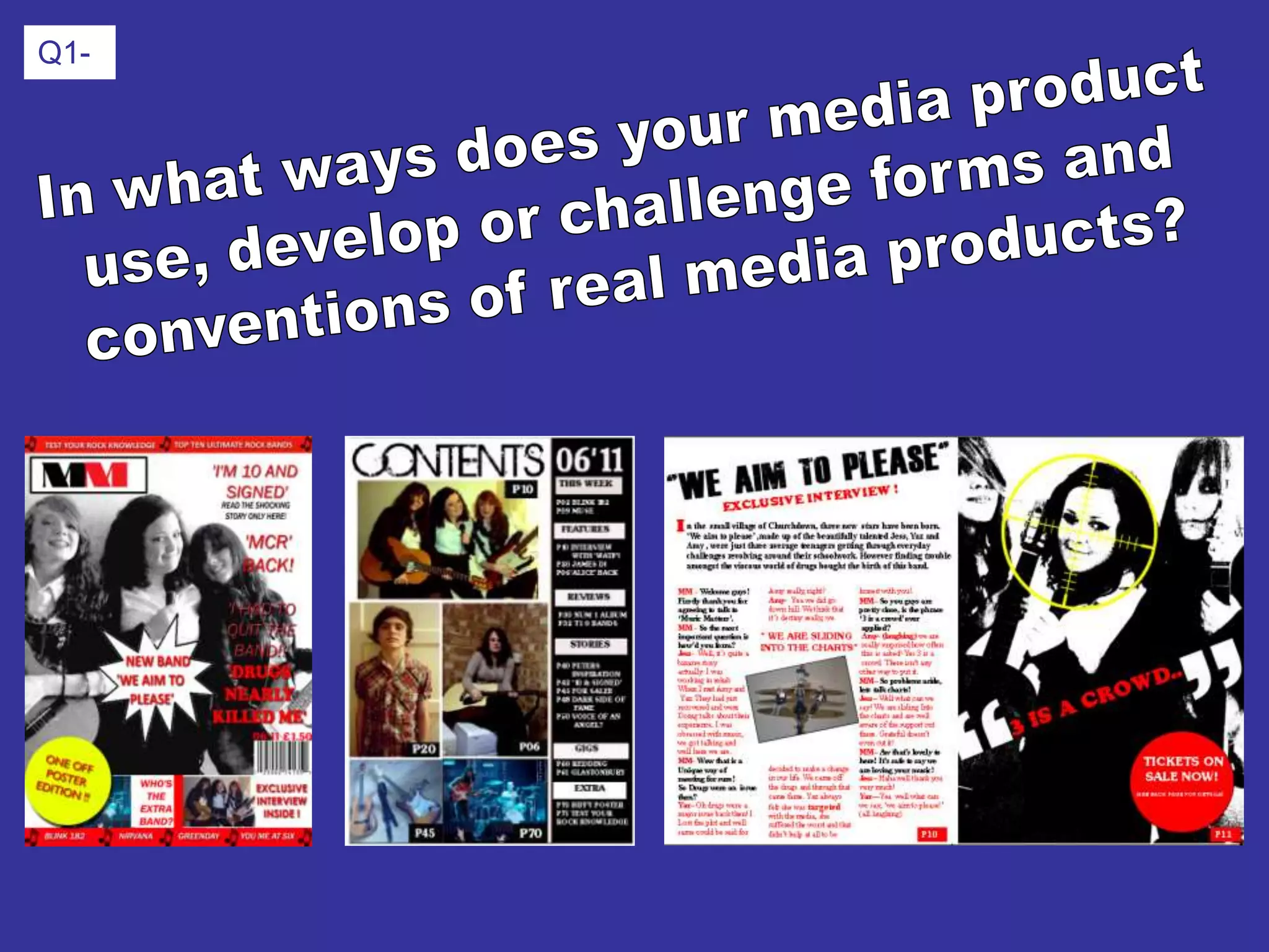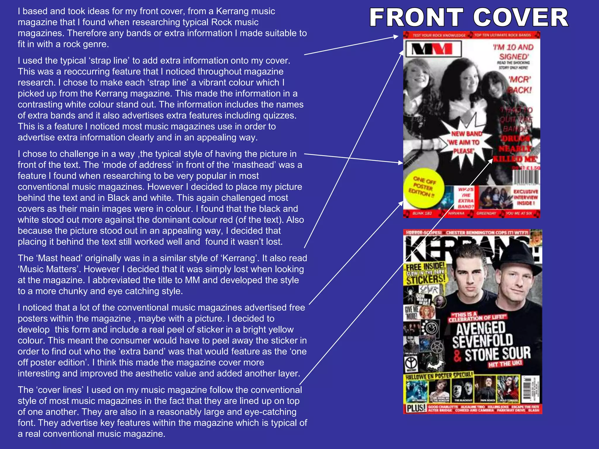 The document summarizes the design choices made for the front cover of a mock rock music magazine. Key aspects included using a "strap line" with band names and feature advertisements in vibrant colors, placing the black and white main image behind the text to make it stand out, abbreviating the "Mast head" title to make it more eye-catching, and including a peel-off sticker with a hidden band name to increase interactivity and aesthetic appeal. The "cover lines" were designed in a conventional lined-up format and large font to advertise magazine features.