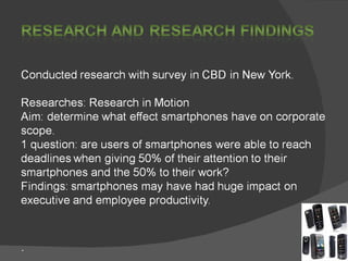 The document discusses how smartphones affect productivity, communication, social engagement, and education based on research. Smartphones differ from regular phones in having more computer-like capabilities such as full keyboards, web browsing, and software. While smartphones are widely used, the document notes they can negatively impact work focus and completion, social interactions, and student attention and writing. The conclusion is that smartphones' disadvantages generally outweigh advantages.