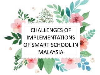 This document discusses the challenges of implementing smart schools in Malaysia. It begins with defining smart schools as learning institutions that have been reformed to prepare students for the digital age using technologies like multimedia. The goals of smart schools are outlined as developing well-rounded individuals, nurturing strengths, creating a tech-savvy workforce, increasing education access, and encouraging stakeholder participation. Some challenges are resistance from senior teachers accustomed to traditional methods, lack of infrastructure in rural schools, insufficient technical support staff, unwilling parents, and students wanting spoon-fed learning instead of discovery. Overcoming these obstacles requires commitment from the Ministry of Education to provide resources, training teachers, gaining parent cooperation, and adapting student expectations.