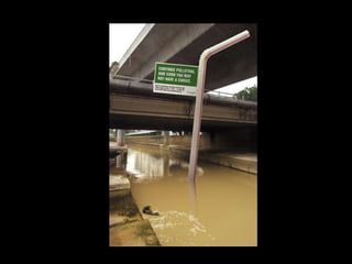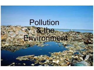 The document discusses various types and causes of pollution including littering, water pollution, and air pollution. It notes that littering costs the US $11.5 billion annually to clean up and that plastic trash in the Pacific Ocean has created a garbage patch twice the size of Texas. Water pollution is also discussed, noting that a third of the world's population lives with water stress. Various sources of air pollution are outlined like vehicle emissions, factories, and smoke stacks. The health effects of air pollution include lung cancer, asthma, and other respiratory issues.