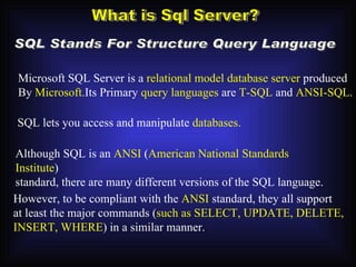 SQL Server is a relational database server produced by Microsoft that uses SQL as its primary query language. SQL Server 2008 R2 added features like master data management and the ability to centrally manage multiple SQL Server instances. SQL consists of data manipulation language to query and update data and data definition language to create and manage database objects like tables.