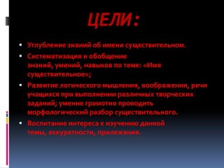 Документ посвящен углублению знаний об имени существительном и систематизации умений по данной теме. Он включает задания для развития логического мышления и речи учащихся, а также элементы чистописания и морфологического разбора. В заключение предлагается исправление речевых ошибок в контексте творческого задания.