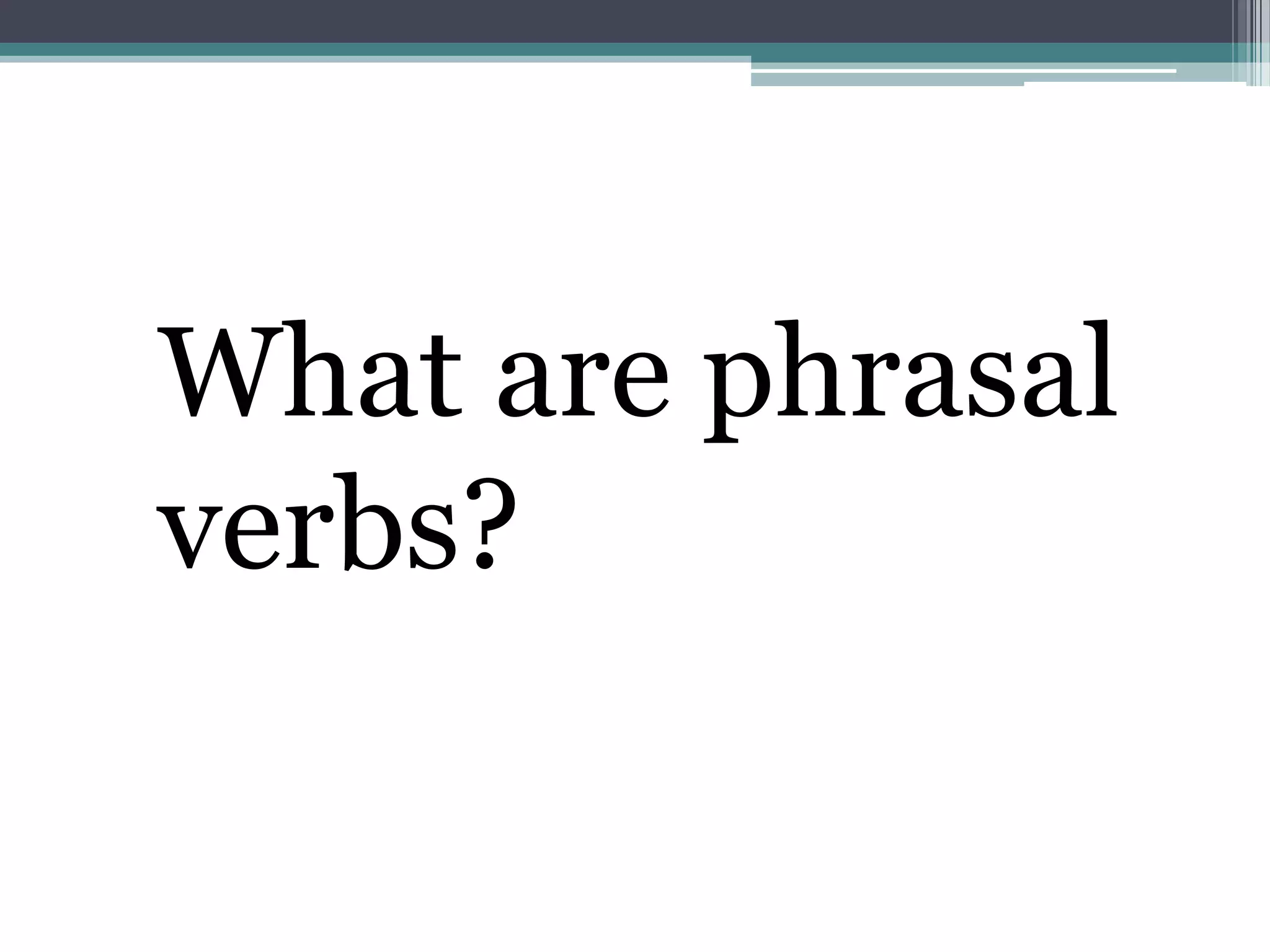 Phrasal verbs are verbs combined with prepositions or adverbs that create meanings different from the original verb. Examples are "ran into" meaning meet and "ran away" meaning leave home. Phrasal verbs can be transitive, taking objects, or intransitive. Some transitive phrasal verbs separate the object from the verb and preposition, while others keep the object after the preposition. Native English speakers commonly use phrasal verbs in everyday conversation.