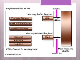 The document discusses processor registers, which are small blocks of fast memory built into the CPU. There are several types of registers that perform different functions like storing instructions (Instruction Register), addresses (Program Counter), or data (Accumulator). Registers provide quicker access than main memory and are used to temporarily store data and instructions during processing. Common registers include the Program Counter, Accumulator, Memory Address Register, and Instruction Register. Registers allow for faster operations but are limited in number.