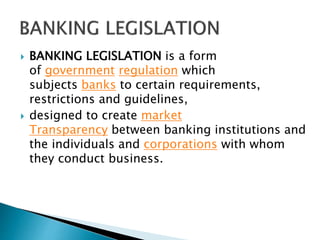 The Banking Regulation Act of 1949 regulates banking firms in India and gives powers to the Reserve Bank of India (RBI) to license and supervise banks. It defines banking and imposes requirements on transactions, management, and penalties for non-compliance. The RBI Act of 1934 established the RBI and provides the framework for RBI to conduct monetary policy and supervise scheduled banks. Key powers include issuing currency, setting reserve ratios, lending to banks and governments, and collecting credit information. Both acts work to create transparency, protect depositors, and ensure smooth functioning of the banking system.