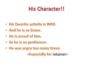 Nobunaga Oda was a powerful daimyo during the Sengoku period of Japan who united much of the country under his rule. Some key events of his career included instituting economic reforms that promoted free trade, breaking the power of the Takeda clan at the Battle of Nagashino using innovative gun strategies, and winning a decisive victory over the Imagawa clan at the Battle of Okehazama through a surprise attack on their camp. Ultimately, Nobunaga had a ambition to conquer all of Japan which he conveyed through his personal seal reading "Tenka Fubu", meaning "Spread militarism over the whole land".