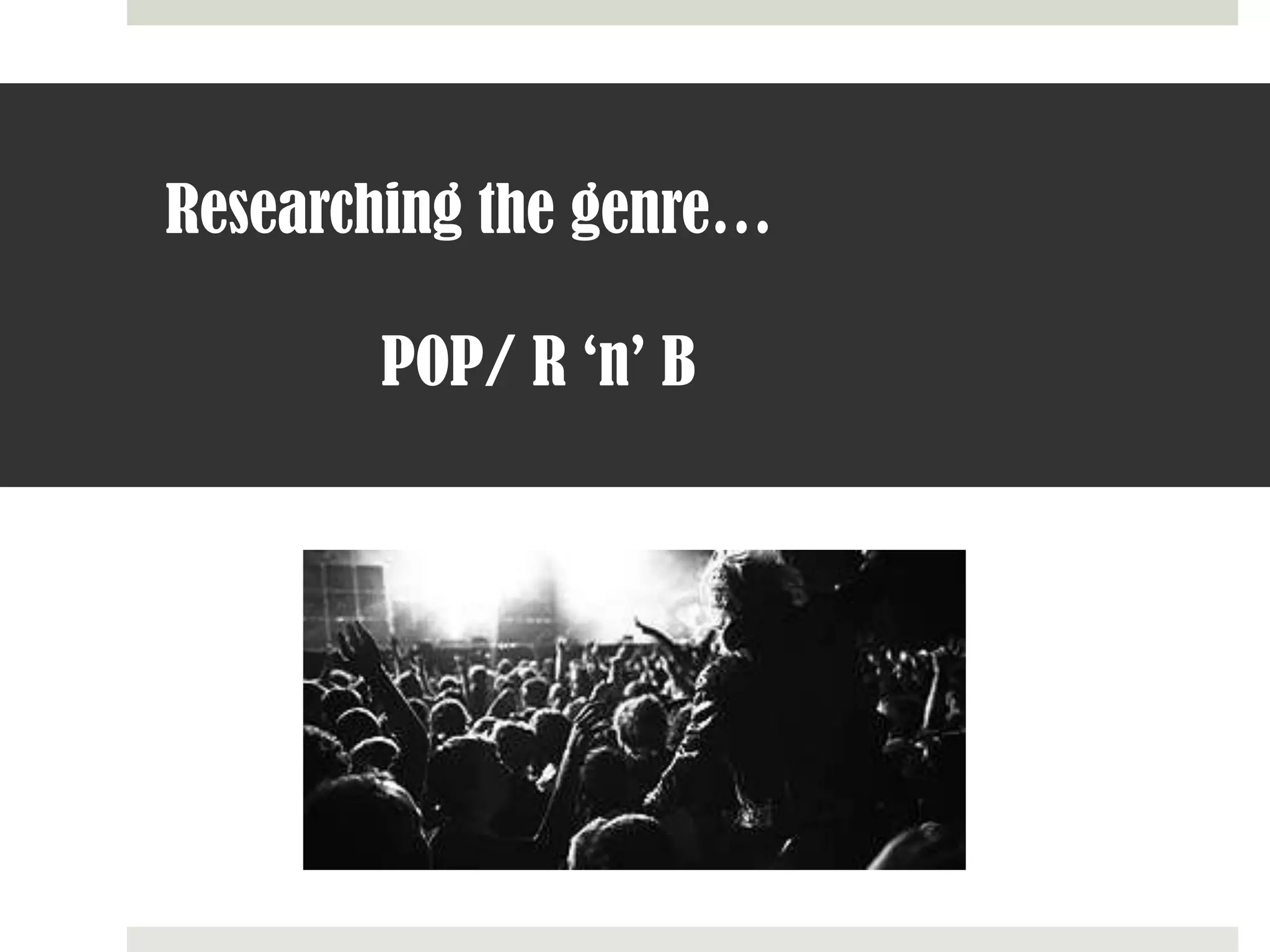 The document discusses the genres of pop and R&B music that were chosen for a song called "Scandalous". Pop music is described as commercially recorded, youth-oriented music featuring short, simple songs utilizing new variations on familiar themes. Popular pop artists mentioned include Girls Aloud, Britney Spears, and Lady Gaga. R&B combines elements of soul, hip hop, and funk and is featured in artists like Beyonce, Jay Z, and Rihanna. The genres of pop and R&B were selected for the song due to the idea of a girl band with a twist, using the R&B genre.
