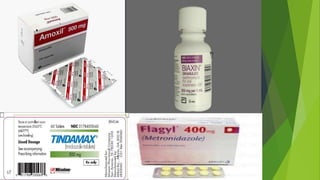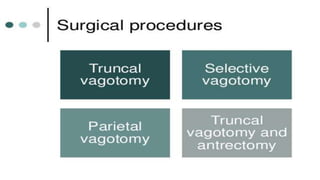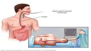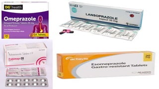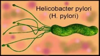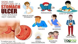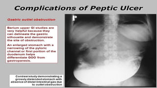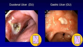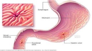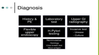 Peptic ulcers form in the lining of the stomach, esophagus, or small intestine. Around 80% of ulcers are caused by Helicobacter pylori bacteria. Symptoms include abdominal pain, nausea, and vomiting of blood. Diagnosis involves tests to detect H. pylori infection and endoscopy to view the ulcers. Treatment focuses on eliminating H. pylori with antibiotics and reducing acid with proton pump inhibitors or H2 blockers to promote healing. Lifestyle changes and medications that protect the stomach lining can also help treat peptic ulcers.