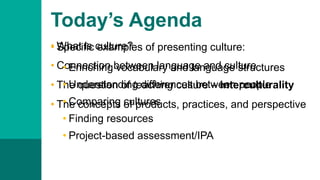 This document discusses integrating culture into foreign language instruction. It defines culture and explains how culture is essential to accurate and complete world language teaching. The document discusses interculturality as a philosophy that emphasizes authentic cultural interaction over intense grammar instruction. Interculturality is student-centered and uses techniques like flipped classrooms and interactions with native speakers to better understand cultural perspectives. The goals are to prepare students for real-world language use and help them appreciate both similarities and differences between cultures. ACTFL standards have increasingly emphasized developing cultural competence alongside language skills over the past 20 years.