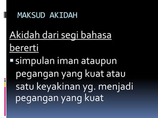Aqidah Islam membahas tentang kepercayaan dasar umat Islam terhadap Allah, malaikat, kitab-kitab suci, nabi-nabi, hari akhirat, dan takdir. Aqidah merupakan pondasi utama agama Islam yang menjelaskan konsep tauhid dan enam rukun iman.