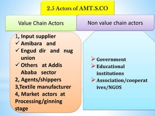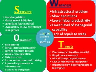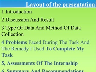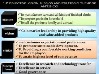 This document summarizes an internship report for Arbaminch Textile S.Co. It discusses the organization's background, products, value chain, infrastructure, quality policy, gender roles, and challenges. The intern worked in various departments including weaving, spinning, production, and engineering. Problems included distance from campus and communication issues. Lessons included differentiating theoretical vs practical skills and improving teamwork. Recommendations included strengthening procurement, maintenance, quality assurance, and developing human resources and marketing skills. The internship provided valuable practical experience in the textile industry.