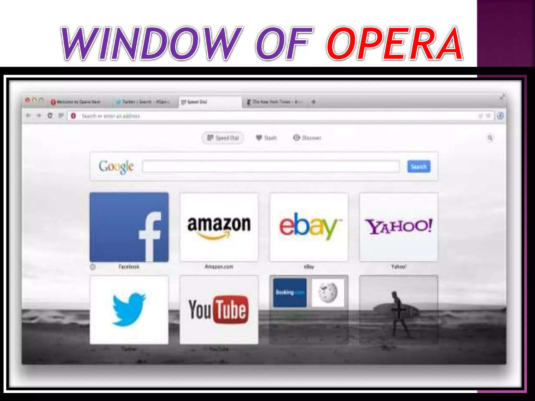 Overview of Opera web browser, its features including Tab stacking and Opera Turbo.