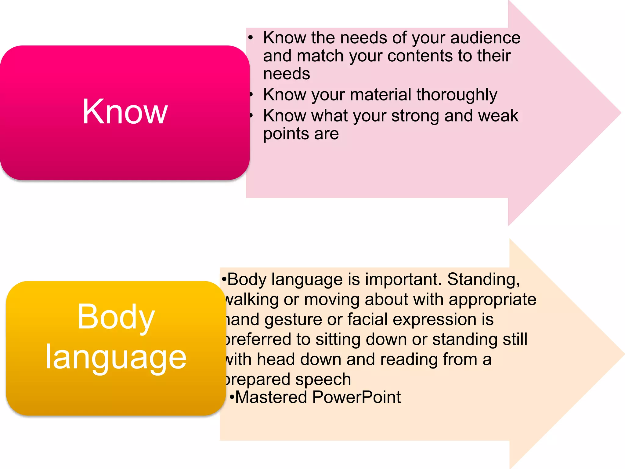 2) Use body language like gestures and facial expressions, and avoid reading from notes for extended periods. Speak loudly, clearly and confidently.
