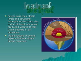 Forces within the Earth can cause earthquakes when rocks break and move, releasing energy that produces vibrations. To prepare, one should create an earthquake plan that identifies a safe place in the home and includes a first aid kit, supplies, and radio. During a quake, drop and cover under sturdy furniture or crouch down and cover your face with your hands if nothing is available. Stay away from windows, doors, and walls, and watch for falling objects. Outdoor safety involves staying away from buildings, lights, and wires, while at school one should follow teacher instructions and not fool around.