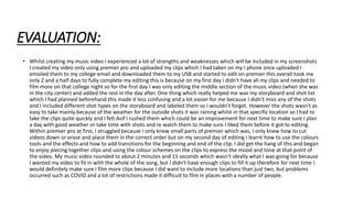 The student created a 2 minute and 15 second music video editing only using Adobe Premiere Pro. They experienced both strengths and weaknesses in the process. Key strengths included having a storyboard and shot list which made editing easier. However, weather issues made some outdoor shots feel rushed. The student also learned new editing techniques in Premiere like using color tools and effects. While happy with sticking to their plan, the main area for improvement is scheduling filming time better to get more clips.