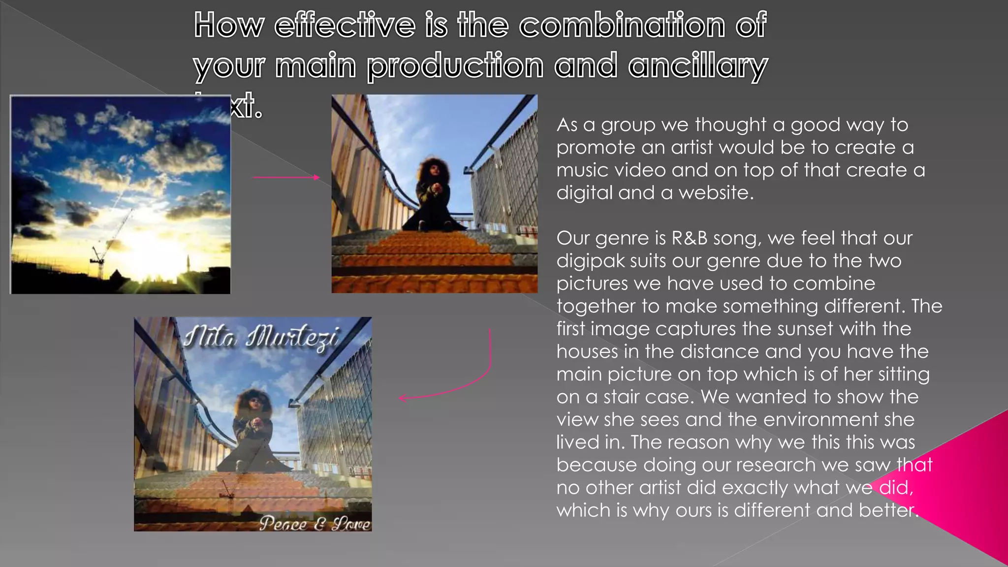 The document summarizes the process of creating a music video and digital album for an R&B artist. Key details include researching other artists' styles, creating a digipak with combined images to make it unique, designing the track list to stand out from others, including photos and messages in the album, and linking the digipak to the music video so viewers know who it is about. Feedback has been positive verbally but limited online possibly due to lack of YouTube accounts. The group gained more views than expected for the short period promoted through emails.