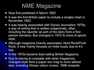 This document discusses two music magazines, NME and Q. It provides details on their histories, target audiences, and multimedia brands. It also analyzes sample double page spreads (DPS) from each magazine, discussing the language, tone, layout, images and how they relate to an envisioned new magazine.