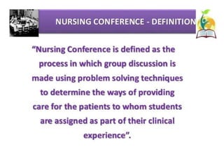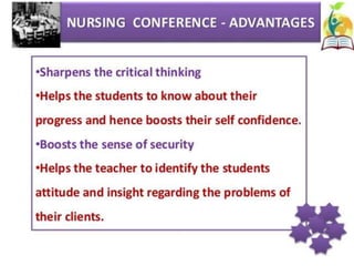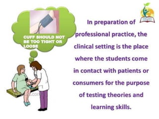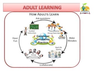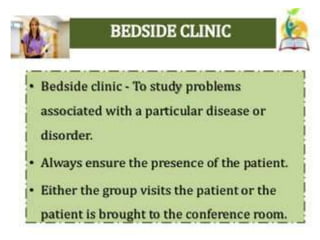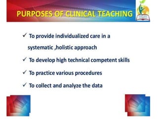 This document discusses clinical teaching methods and adult learning principles. It begins by outlining learning outcomes which are to explain the learning environment, describe learning, list principles of adult learning, and describe different methods of clinical teaching. It then discusses principles of adult learning according to Knowles, including that adults are internally motivated, bring life experiences, are goal oriented, prefer relevance, and like to be respected. The document also lists various clinical teaching methods such as nursing conferences, demonstrations, case studies, role plays, and ward rounds. It concludes by summarizing the key topics covered.