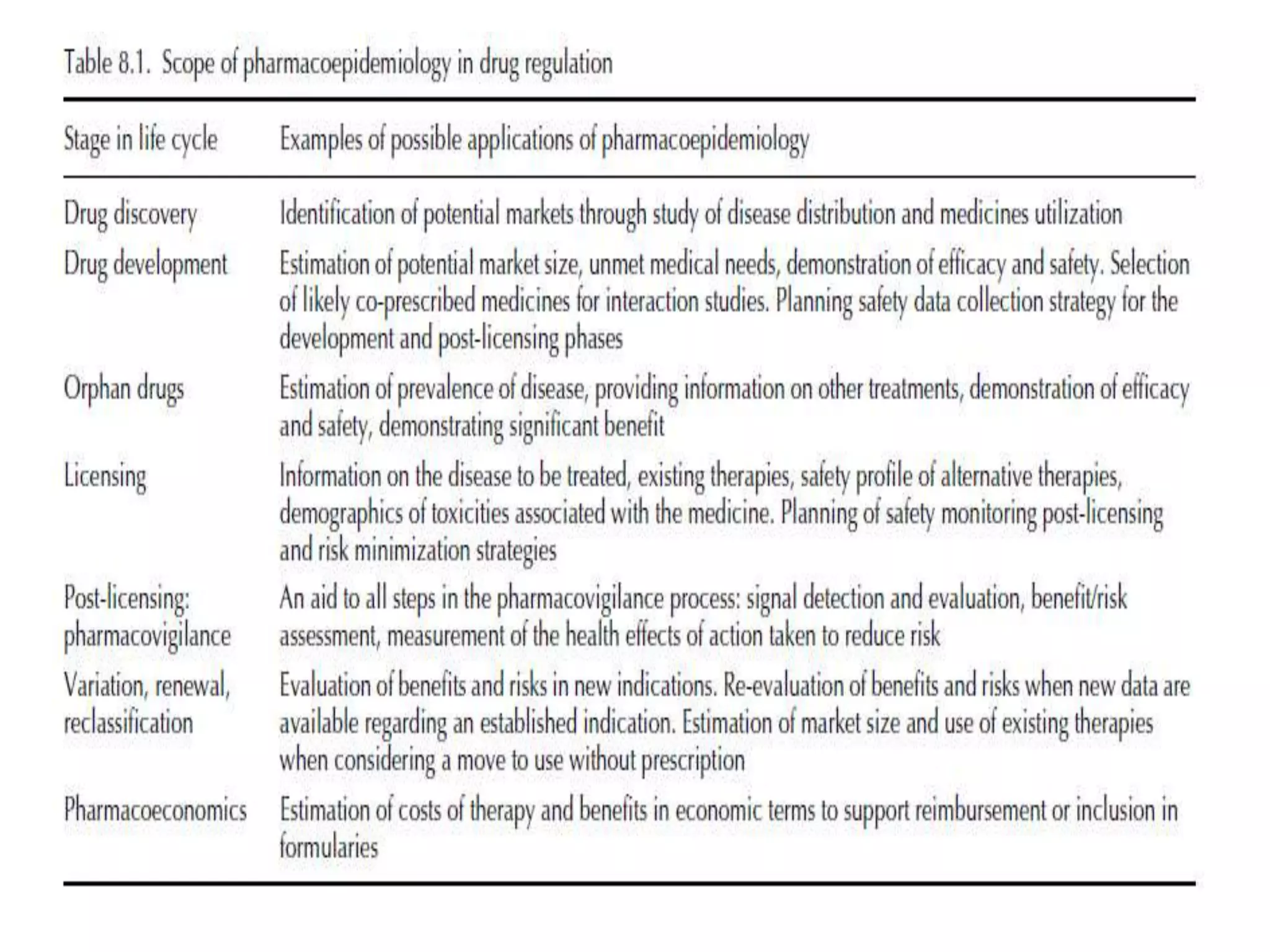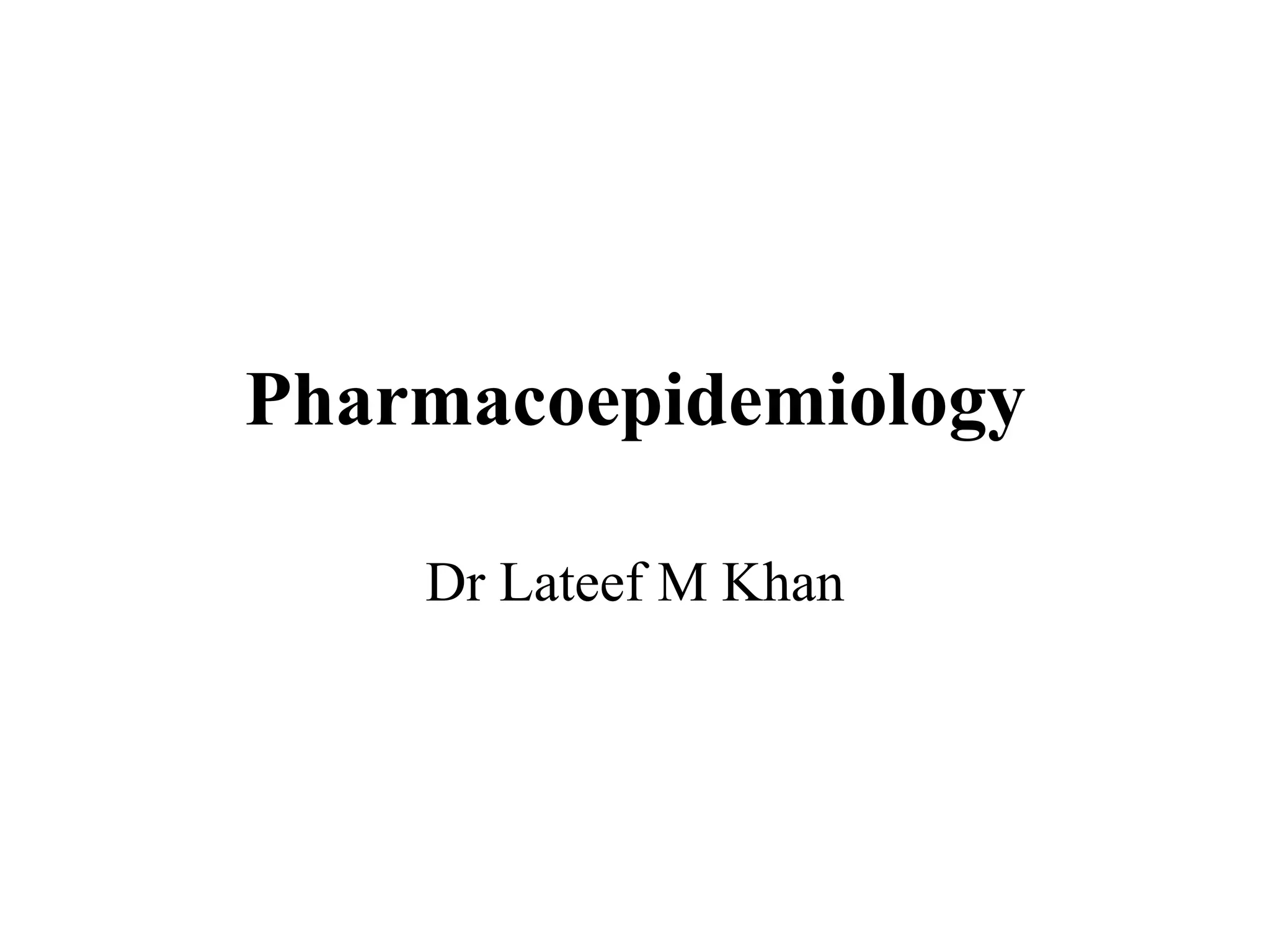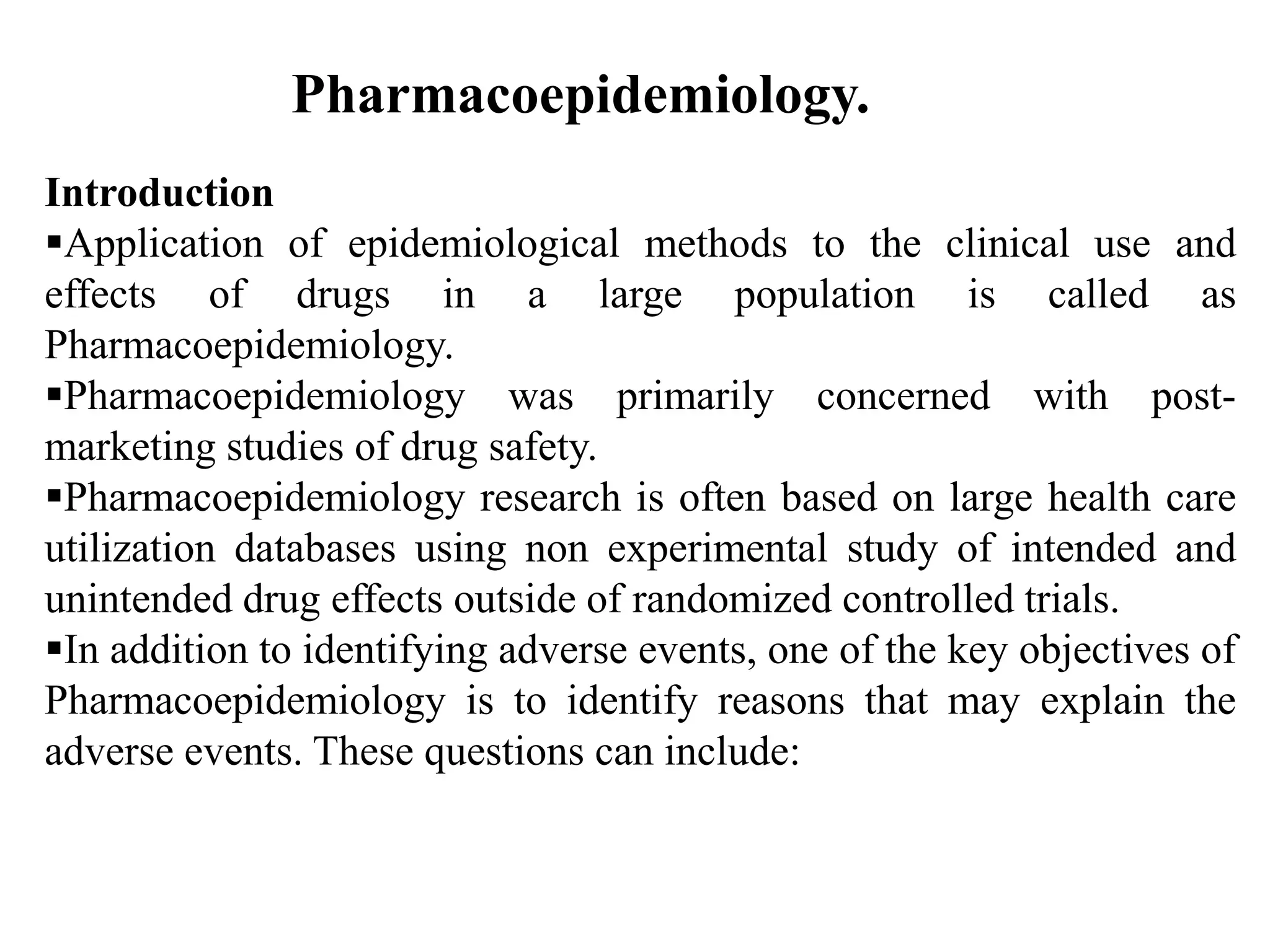 Pharmacoepidemiology involves applying epidemiological methods to study drug use and effects in large populations. It is primarily concerned with post-marketing drug safety surveillance but also analyzes patterns of drug use and assesses effectiveness. Pharmacoepidemiological studies use large healthcare databases and are important for identifying adverse drug reactions, determining risk factors, and improving appropriate medication use. Common study designs include cohort studies, case-control studies, and randomized controlled trials. Pharmacoepidemiology plays a key role in drug regulation, marketing, clinical practice, and public health policy.